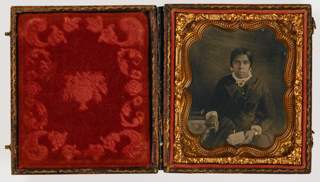 The set of 286 objects dates back from the 1840s to the mid-1920s and includes 40 daguerreotypes made by three prominent Black photographers of the 19th century, James P. Ball, Glenalvin Goodridge, and Augustus Washington. The collection is the largest of this type of work in the country, surpassing the Library of Congress’ collection of 26 daguerreotypes. The collection also includes photographic jewelry, objects worn on the body embedded with tiny daguerreotypes, or other types of photos, some even with locks of hair. The collection, made by and for Black people, is considered “the rarest of the rare.” Portraits of abolitionists and photographs of key Underground Railroad figures – both Black and white – are also included.