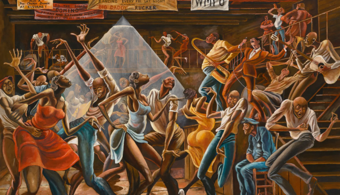 Inspired by Barnes’ childhood memories of his North Carolina town, the painting depicts a dance hall filled with a variety of Black characters all in vibrant hues as they move to the sounds of the band. The elongation of the subjects has become a style known as Black Romantic. Not only did the work become a cultural symbol, as evidenced by its portrayal in other culturally iconic moments, but Barnes himself also rose to cultural prominence.
