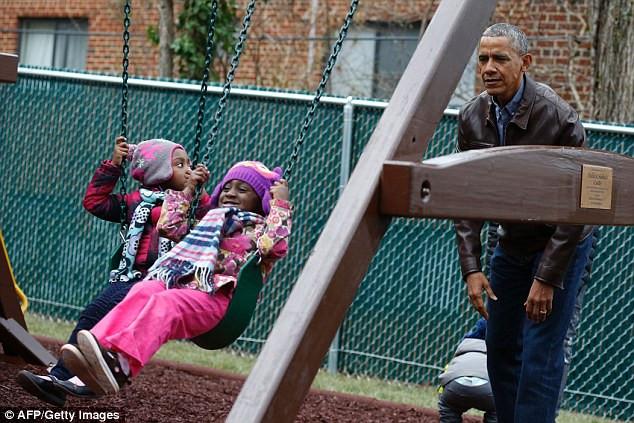 As President Obama pushed one of the little girls on the swings at the shelter he said: “It’s bringing back memories…This is about how big Sasha was when we showed up.”(Malia was 10, and Sasha was 7)