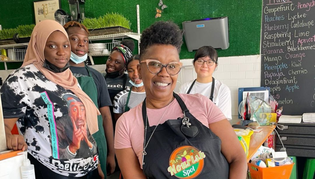 “I was on my own health journey to lose weight and get back to a size 8 from a size 16 after working nearly 16 years [in the corporate world]. There were no healthy food spots in my southeast Jamaica, Queens community which is often referred to as a “food desert,” Kelly told Because Of Them We Can.