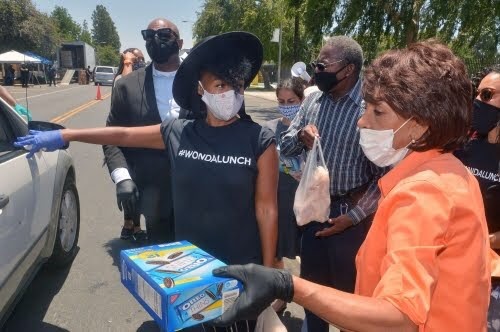 Monáe’s WondaLunch food program teamed up with Congresswoman Waters, Nanette Diaz Barragan, actress Yara Shahidi and political commentator Angela Rye to help provide meals to families impacted by the coronavirus pandemic. The event took place this week at Ted Watkins Memorial Park in Los Angeles. Monáe and Waters, along with other volunteers, passed out food meal kits that included fresh fruit, vegetables and poultry. Thousands drove through to pick up meal kits while social distancing.