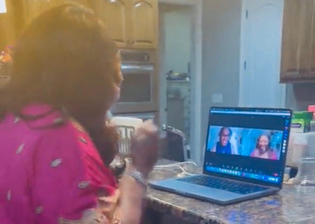 Then the long-awaited moment occurred, Thomas’ mother seated at the kitchen island in front of the computer. When her childhood friend Angela joined the call, she gasped before closing her eyes in shock and giddily jumping in her seat for joy. In a touching moment, she stretched out her arms before the screen to give an air hug to her old friend pictured on the screen.