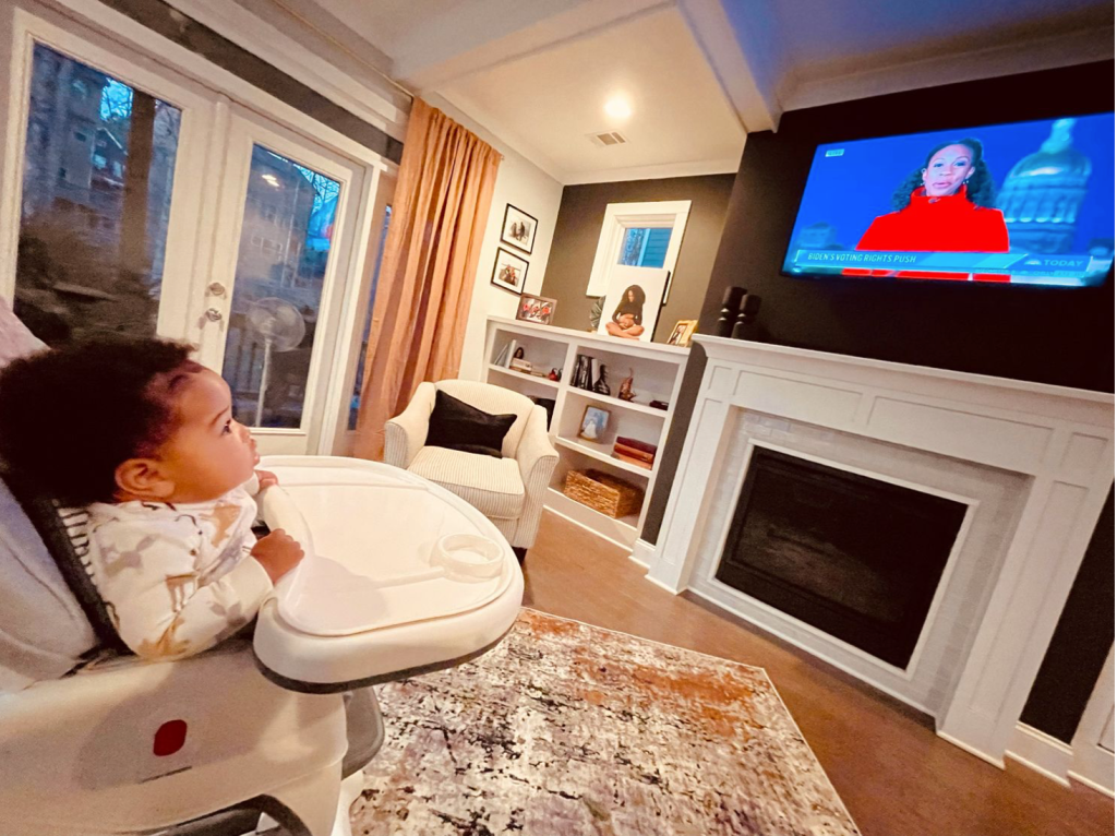Entrepreneur Jay Bailey took to social media to share a proud moment he captured of his infant daughter. Sitting in her highchair, baby Sage can be seen staring at the television screen, almost in awe as she watches a news reporter who just so happens to be her mother.