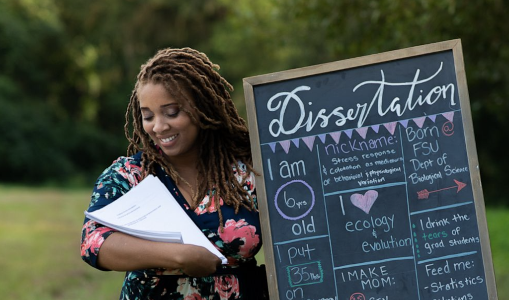 That’s when she decided to do a maternity shoot with her newborn baby, “Stress Response and Coloration as Mediators of Behavioral and Physiological Variation.” The Florida State University student called up her friend Korie Mitchell and the two made doctoral magic happen. The pictures showed Humphrey posing with her paper next to its milestones, in a highchair and with a beautiful picturesque background as she gazes down lovingly. It was typical maternity shoot wonder.