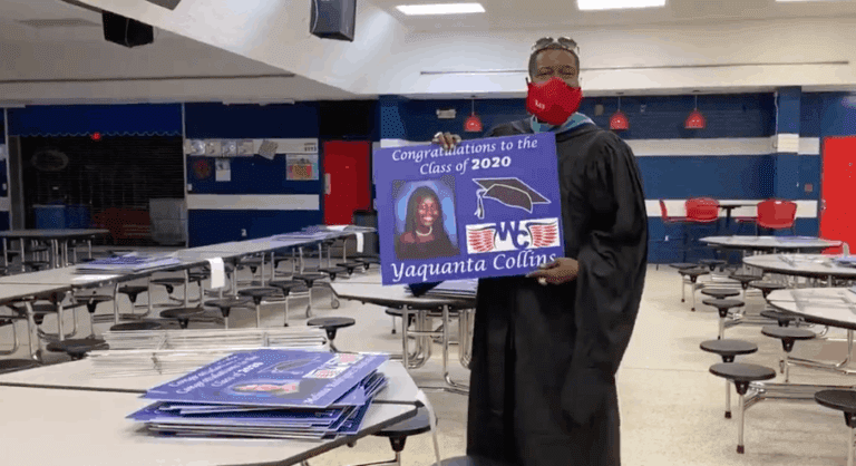 According to EdNC, the West Craven High School principal decided to organize a parade. Wallace, dressed in full cap and gown and went to visit seniors, donned with a stack of personalized yard signs with each student’s face on it and a message of encouragement, “You will graduate.” Wallace visited 24 students personally with the rest of the student roster split up between staff. In total, 14 groups, led by a caravan of teachers, coaches, police officers, firefighters and community leaders, visited 220 seniors from West Craven High, covering 485 square miles, taking a total of four hours.
